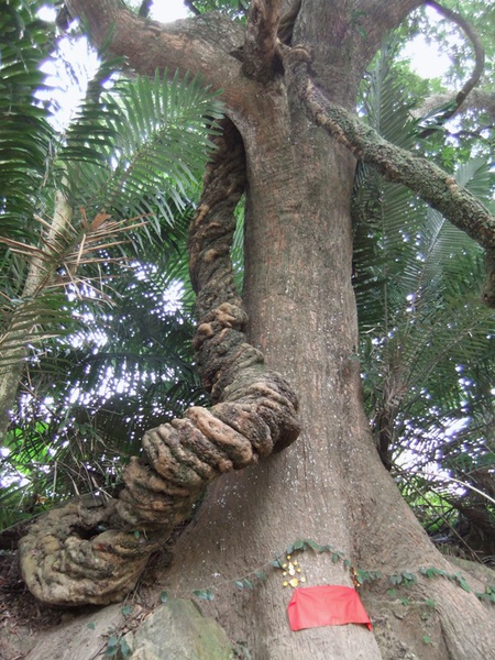 再往山上走,「古樟奇藤」則是到大窩一定要來膜拜一下的奇景。老樟樹枝葉遮天,生氣蓬勃,而樹上如麻花捲一般的巨藤則與之相安無事,反倒像是裝飾品一般的垂掛在枝椏間,共榮共生。樹根處紮著紅布,下方供奉著土地公,想必應該是十分靈驗吧!