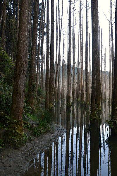 水漾森林是 921 大地震後在南投山區形成的一個堰塞湖,湖水蓄積之後反而導致原本生長於該區的杉木因根部窒息而枯死,形成一片蕭瑟的枯木林。枯木無語,安靜地矗立湖中,濃綠的湖水如鏡子一般映照著山谷風光,山嵐霧氣時常相伴更讓水漾森林增添許多神秘。因為水漾森林的位置離溪阿縱走的路線不遠,因此被發現後便一直是許多登山客愛去的景點之一。
